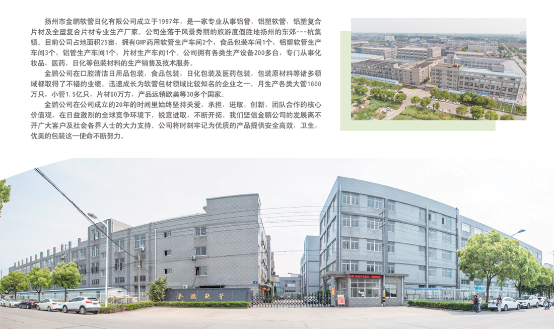扬州市金鹏软管日化有限公司成立于1997年,是一家专业从事铝管,铝塑软管,铝塑复合片材及全塑复合片材专业生产厂家。公司坐落于风景秀丽的旅游度假胜地扬州的东郊---杭集镇。目前公司占地面积25亩,拥有GMP药用软管生产车间2个,食品包装车间1个,铝塑软管生产车间3个,铝管生产车间1个,片材生产车间1个。公司拥有各类生产设备200多台,专门从事化妆品,医药,日化等包装材料的生产销售及技术服务。